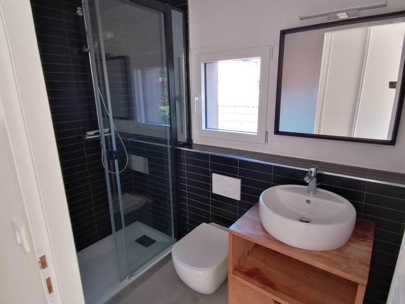Au coeur du centre-village, proche de tous les commerces de proximité. Cuisine équipée donnant sur un petit balcon, salon donnant sur une terrasse avec une vue dégagée, une salle de douche avec WC et une chambre avec dressing à l’étage.