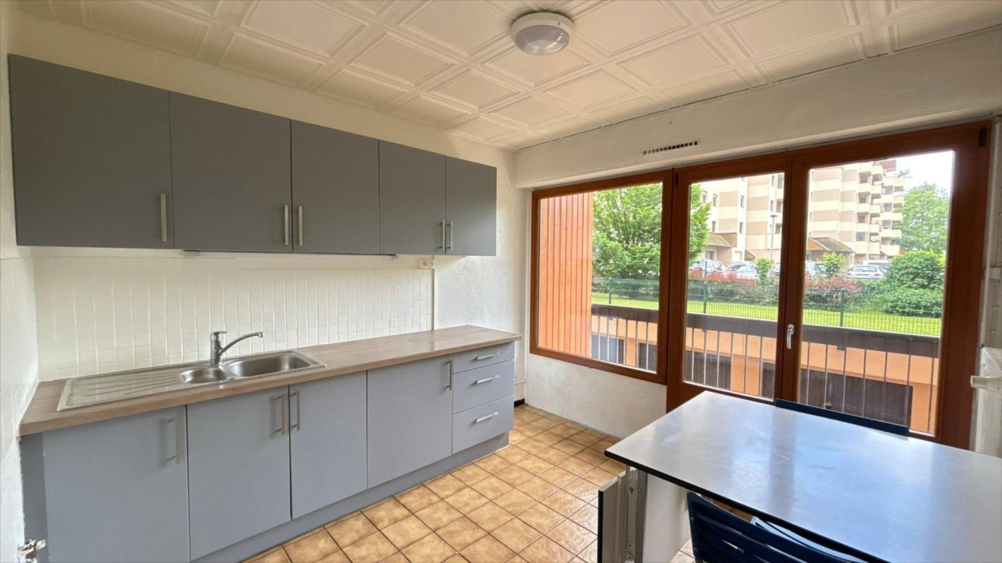 AMBILLY, Rue des Marronniers, proche douane Mon idée et du parc d’Ambilly, à louer appartement traversant 2 pièces au rez de chaussée comprenant cuisine aménagée, grand balcon au calme, nombreux rangements. Parking collectif et cave. Disponible le 09/04/26 (Réf 10226).