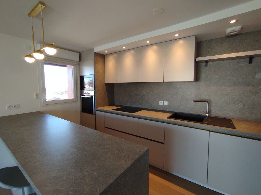 L’appartement dispose d’une belle pièce de vie avec une cuisine ouverte moderne, aux goûts du jour, réalisé avec de beaux matériaux et pensée pour le confort quotidien ainsi que de deux chambres avec dressing.